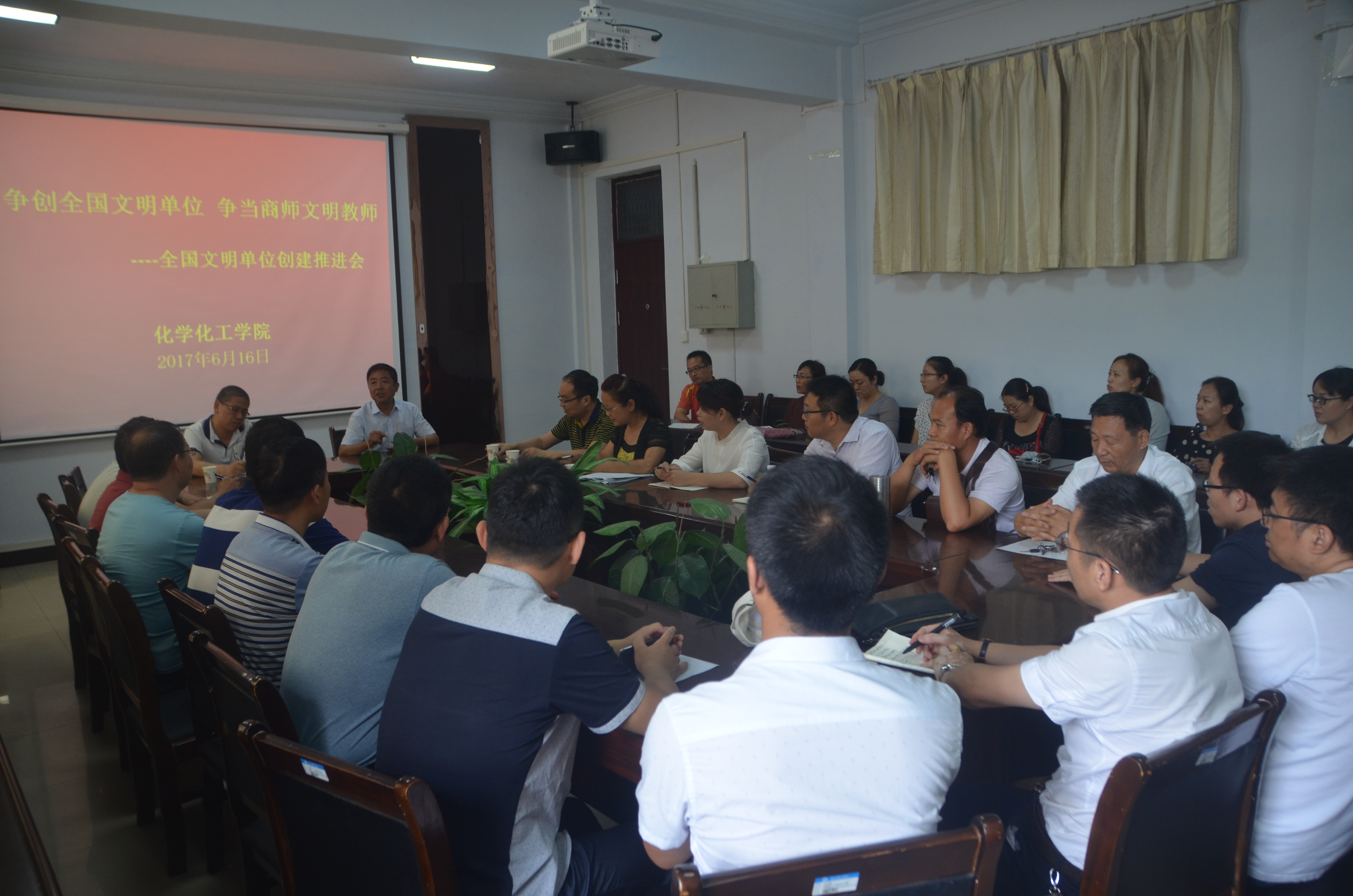 为了进一步优化育人环境,加强学院文明单位建设,6月16日下午,公司于公司文化路校区7号楼会议室召开了“争创全国文明单位,争当商师文明教师”全国文明单位创建推进会,公司党总支书记韩忠民、经理瞿鹏、党总支副书记刘瑛、副经理孟团结出席了此次会议,公司全体教师参加了此次会议,会议由韩忠民书记主持。