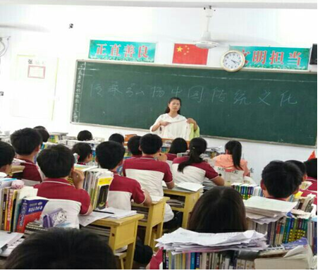 团队一行七人在高一(1)教室举办了以汉服体验和汉服配饰欣赏的艺术体验活动。员工热情很高,老师也被吸引,在教室里团队志愿者向同学们介绍汉服,了解她的特色和非凡的美丽。