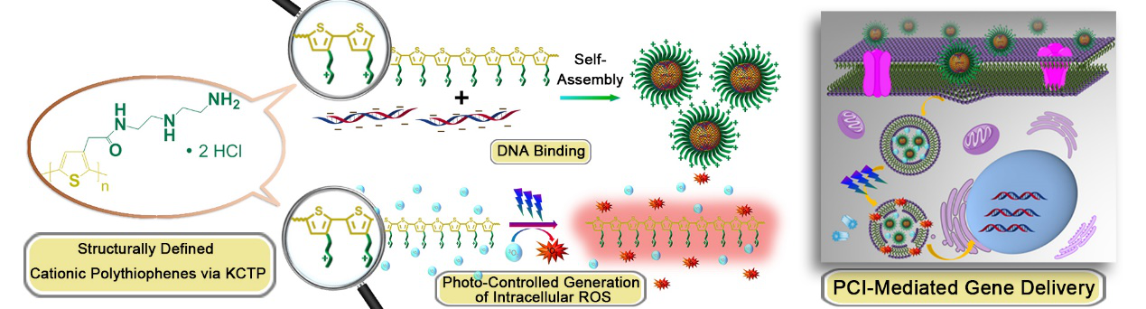 水溶性聚噻吩(cPT)在化学传感、生物成像、疾病诊断和治疗领域具有广阔的应用前景。然而,目前cPT的聚合方法主要遵循逐步聚合的反应机理,面临分子量不可控、分子量分布过宽、端基修饰困难、区域规整性差等问题。张弛博士首次采用可控聚合的方式合成了cPT,并作为基因载体成功用于基因治疗过程。可控聚合所合成cPT具有很强的基因包载能力和较低的细胞毒性,并且在光照条件下能够产生一定量的活性氧,促进基因的溶酶体逃逸过程。