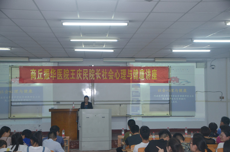 接着,河南医学专科学校管理教研室主任、商丘振华医院执行经理王庆民从健康概述、人类经历的三次卫生革命、影响人类健康的四大危害因素及影响健康的社会诸因素概述四个方面为大家带来了一场视听盛宴——“社会心理与健康”讲座。王经理对社会医学与心理健康做了认真细致的讲解,旁征博引、深入浅出、通俗易懂、实用性强,使大家对“健康”有了更深入的理解。此外,王经理还送给大家“少吃多动,少荤多素,合理营养,适量运动”四句话,希望大家都能够拥有一个健康的身心。现场气氛十分活跃,大家不时被王经理的幽默逗笑,并发自内心的为其热烈鼓掌。