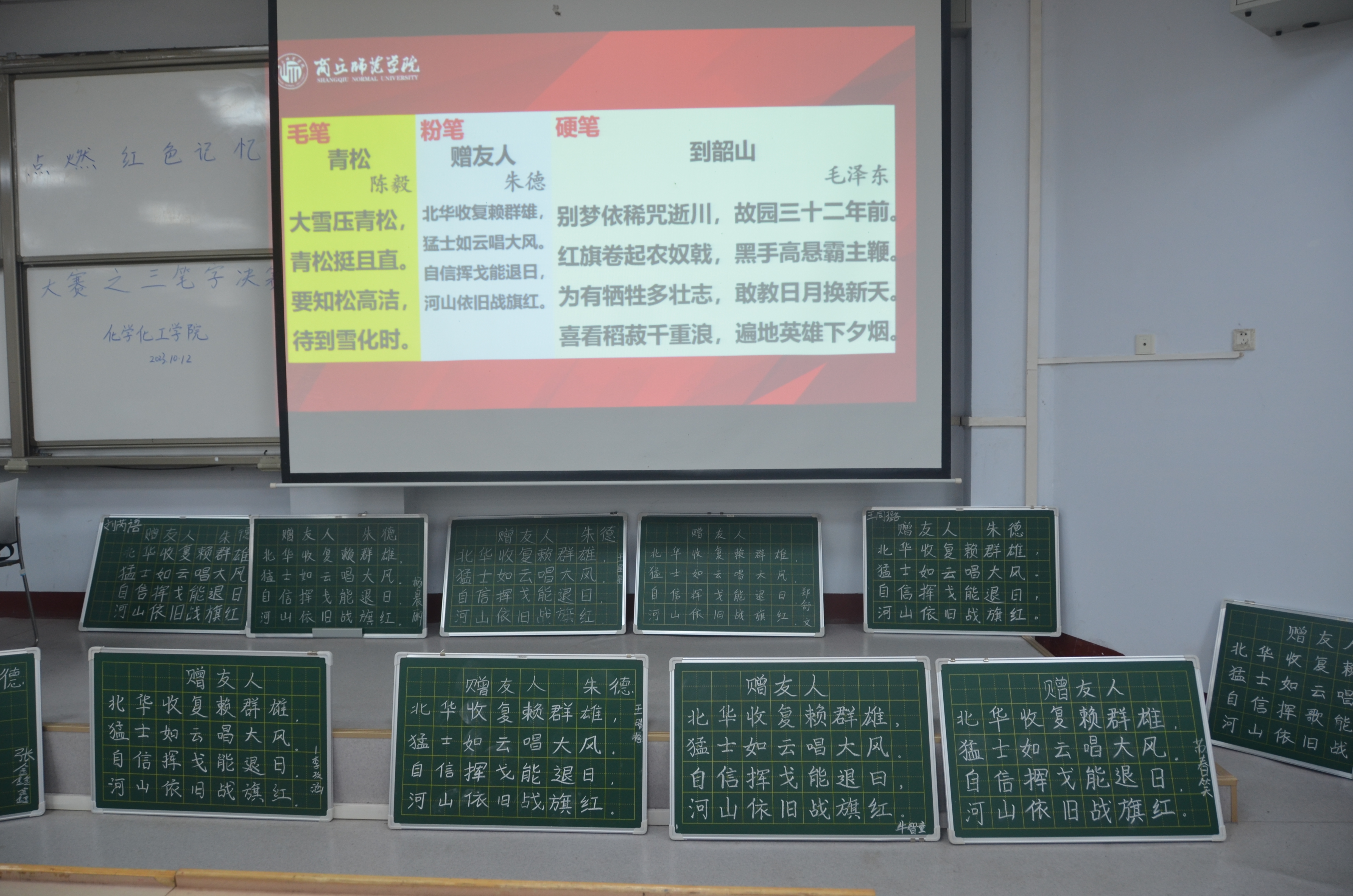 本次比赛分为硬笔字书写、粉笔字书写及毛笔字书写三项。硬笔字书写以《到韶山》为题;粉笔字书写以《赠友人》为题;毛笔字书写以《青松》为题。比赛要求笔画长短得当、角度准确、形神兼备,轻重过渡自然,快慢变化有节奏,字体风格统一、大小均匀、重心平稳、主笔突出、收放自如。