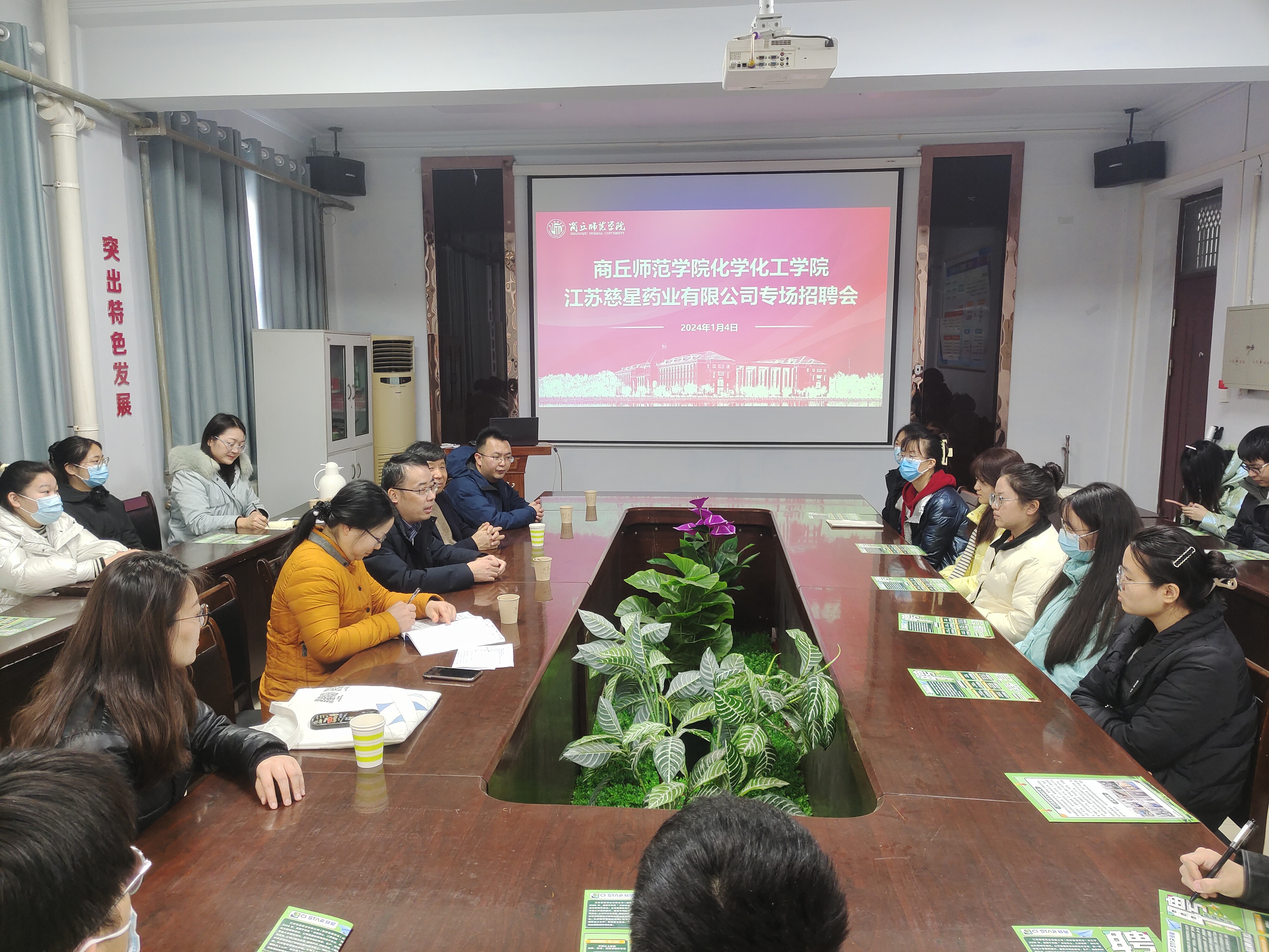 为进一步促进毕业生就业,积极主动为员工搭建就业服务平台,实现企业人才需求与毕业生有效对接,beats365唯一官方网站于7号楼学院会议室举行江苏慈星药业有限公司专场招聘会。江苏慈星药业有限公司总经理马德营(原商丘师专84届化学系毕业生)、人事总监樊万琪、人事经理孟雅萍、公司党委书记李海涛、经理张银堂、公司党委副书记张颜梅出席,学工办副主任郭冠群、组织员王舒欣和辅导员李龙梅以及2024届部分毕业生参加。招聘会由张颜梅主持。