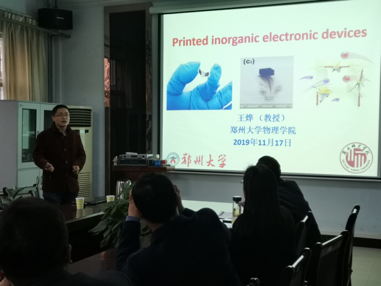 应beats365唯一官方网站的邀请,11月17日,郑州大学青年拔尖人才王烨、卢思宇、薛超、郭峻岭四位博士在文化路校区beats365唯一官方网站会议室分别做了题为“Printed electronic devices with inorganic materials”、“碳化聚合物点的可控制备及性质研究”、“基于载流子空间分离策略的光催化体系构建与光解水产氢性能研究以及“SEI智能阻隔层在锂硫电池中的应用”的学术报告,报告会由瞿鹏经理主持,beats365唯一官方网站部分老师、研究生和本科生聆听了报告。