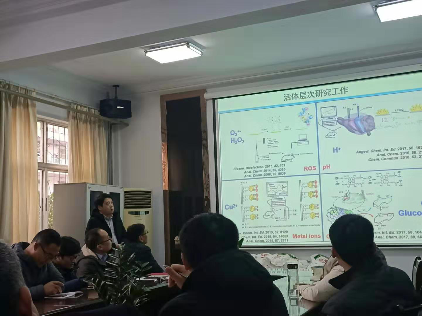 董辉博士向大家汇报了攻读博士期间关于缺血和阿尔兹海默病关联性分子检测方面所做的相关工作以及下一步工作计划。首先介绍了缺血和阿尔兹海默病关联性分子分析的研究背景、关键科学问题、研究策略等;然后具体讲解了博士期间在导师指导下开展的研究工作,包括:缺血及阿尔兹海默症鼠脑中氯离子的高准确比率型分析;Turn-on型电化学传感用于鼠脑内多硫化物和硫化氢的同时分析;单分子比率型SERS探针用于鼠脑中多种活性硫的同时分析。此外,董辉博士汇报了博士期间与组内合作完成的部分工作,包括:整合一体化环状RGD纳米界面原位检测循环肿瘤细胞和膜蛋白;识别分子设计、合成及构建适用于活体Cu+及pH同时检测的比率型生物传感器;自由移动鼠脑中多离子实时分析及电化学成像。相关研究成果发表在Angew. Chem. Int. Ed., Chem. Commun.和ACS chem. Neurosci.等国际期刊上。最后,董辉博士结合研究生期间的研究基础汇报了拟申请2020国家自然科学基金的研究计划。