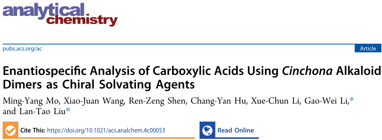 近日,BEAT365英国官网网站与郑州大学联合培养的2021级有机化学专业硕士研究生莫明洋作为第一作者在国际知名期刊Analytical Chemistry(中科院一区,IF=7.4,TOP期刊)上发表了题为“Enantiospecific Analysis of Carboxylic Acids Using Cinchona Alkaloid Dimers as Chiral Solvating Agents”的研究论文(论文链接:https://doi.org/10.1021/acs.analchem.4c00053)。该研究报道了一种基于金鸡纳碱二聚体为核磁共振手性位移试剂,通过核磁共振波谱技术对扁桃酸及其衍生物进行高效、快速与准确的手性识别与分析。