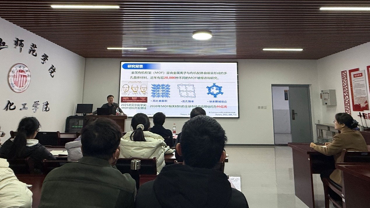 庞欢教授系统介绍了金属有机框架(MOF)材料的研究背景与发展现状,指出其在能源、环境等领域的巨大应用潜力。他围绕纳米MOF材料的精准合成与性能调控,重点阐述了基于软硬酸碱原则的框架稳定性设计、配体工程与晶面调控策略、以及MOF衍生物与复合材料的构建方法。通过多项创新案例,如双配体策略提升电化学循环稳定性、多金属MOF正极实现高容量锂硫电池、氟化框架调控离子传输行为等,庞欢教授生动展示了纳米MOF在超级电容器、锌碘电池、光催化固氮等方向的功能化应用。此外,他还分享了人工智能在MOF材料设计与性能预测中的前沿进展,强调“材料开发正步入数据驱动的新阶段”。