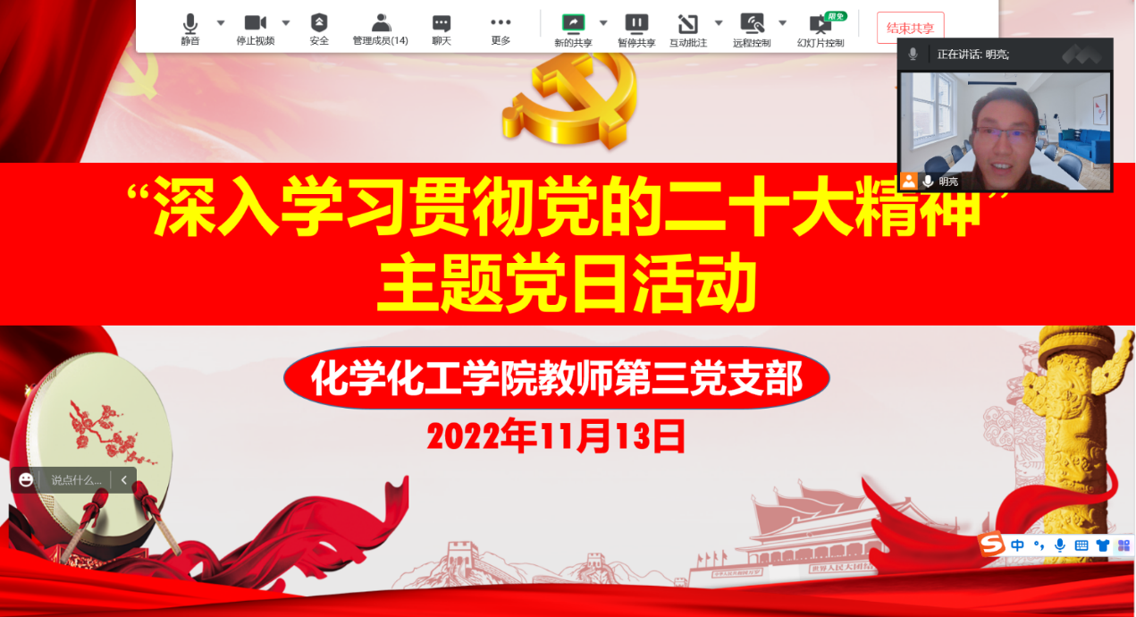为在思想和行动上与党中央保持一致,11月13日,beats365唯一官方网站教师第三党支部利用腾讯会议举行“深入学习宣传贯彻党的二十大精神”线上主题党日活动。本次活动由党支部书记张明亮同志主持,支部全体党员参与。