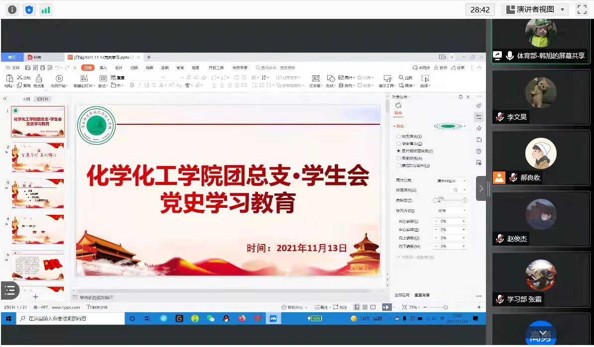 为进一步贯彻落实习近平总书记在党史学习教育大会上的重要讲话精神,提高同学们的思想高度,坚定理想信念。11月13日中午,beats365唯一官方网站团总支·员工会于线上组织开展党史学习教育。
