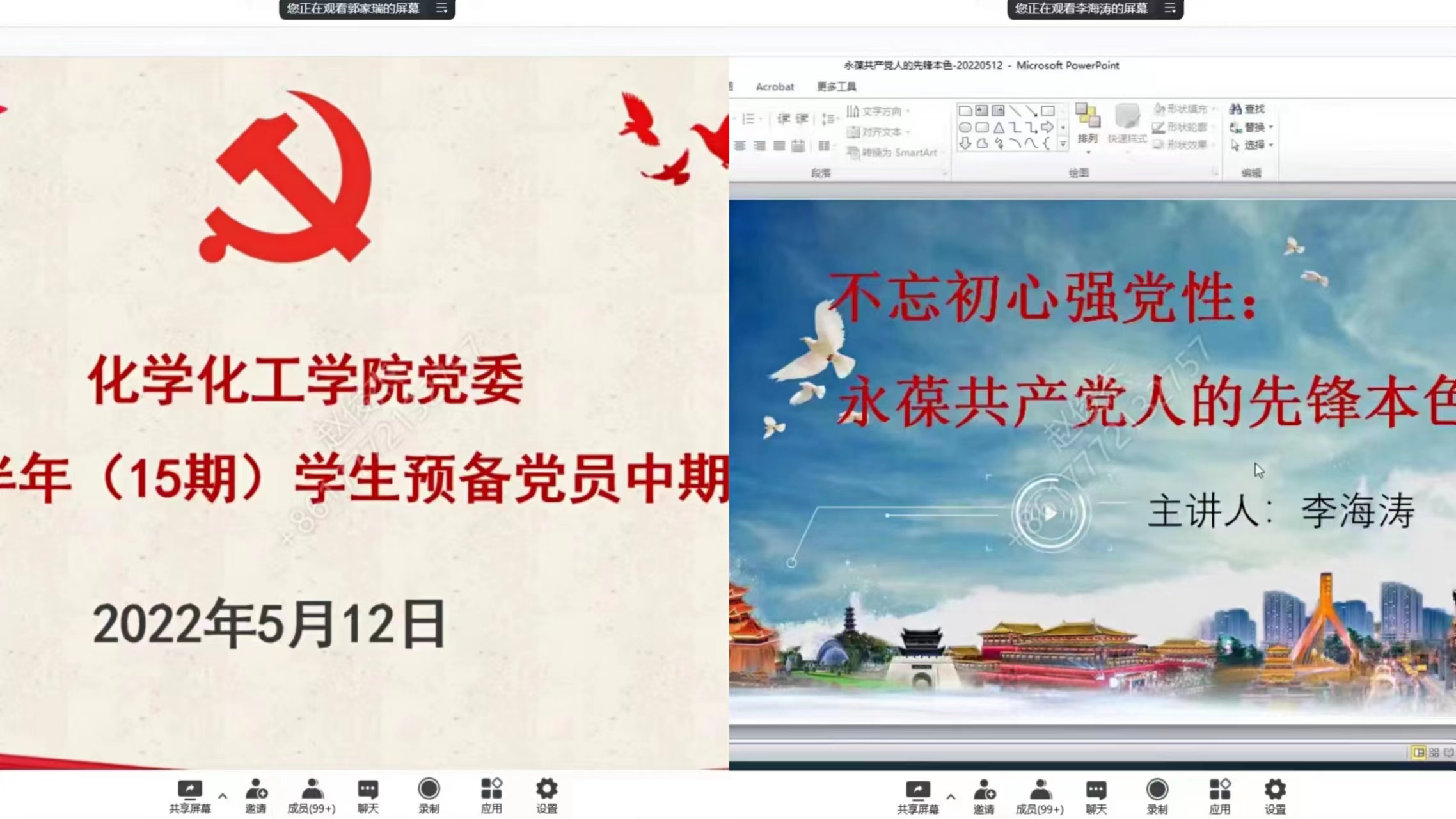 5月12日,公司党委开展了2022年上半年(15期)员工预备党员中期培训专题党课第一讲,由公司党委书记李海涛主讲,员工党支部书记和全体员工党员参加。