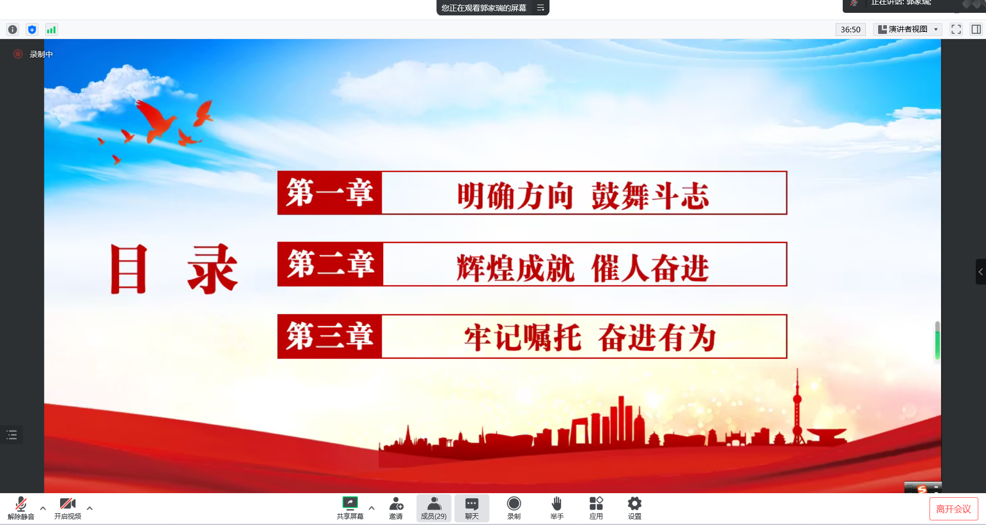郭家瑞以“听二十大奋进之声,做新时代有为青年--深刻理解过去五年的工作和新时代十年的伟大变革”为题,从“大会主题阐释、深刻理解过去五年的工作和新时代十年的伟大变革、做新时代奋进有为青年”三个方面解读了大会主题的深刻内涵,通过丰富的案例展示了新时代十年党和国家事业取得的伟大变革和伟大成就,引领大家深刻理解新时代十年的伟大变革根本在于有以习近平同志为核心的党中央的运筹帷幄,在于有习近平新时代中国特色社会主义思想的举旗定向,“两个确立”从根本上推动着党和国家事业行稳致远,在百年变局中不断开拓新局面。郭家瑞号召大家,要牢记习近平总书记和人民的嘱托,立志做有理想、敢担当、能吃苦、肯奋斗的新时代青年。