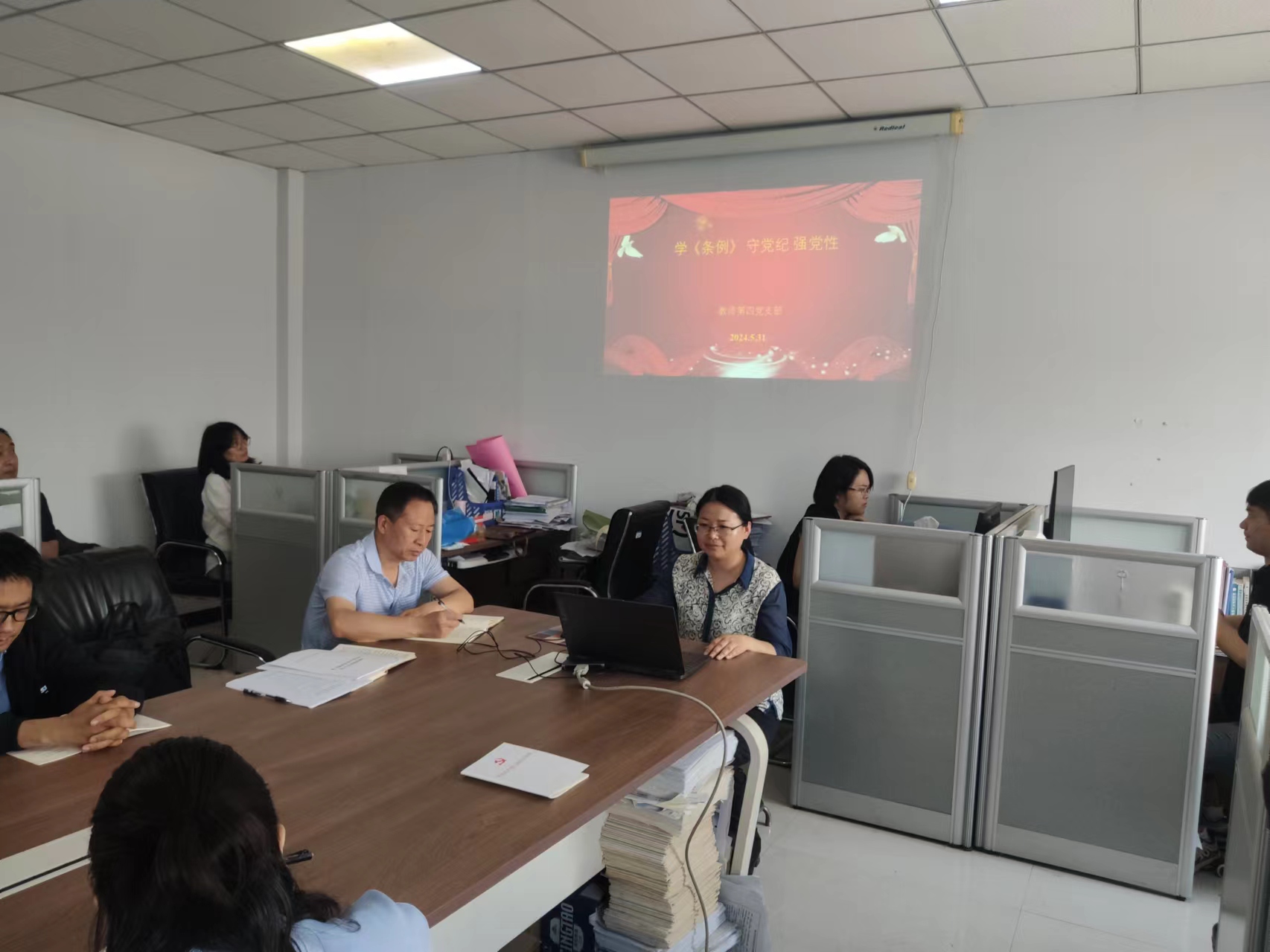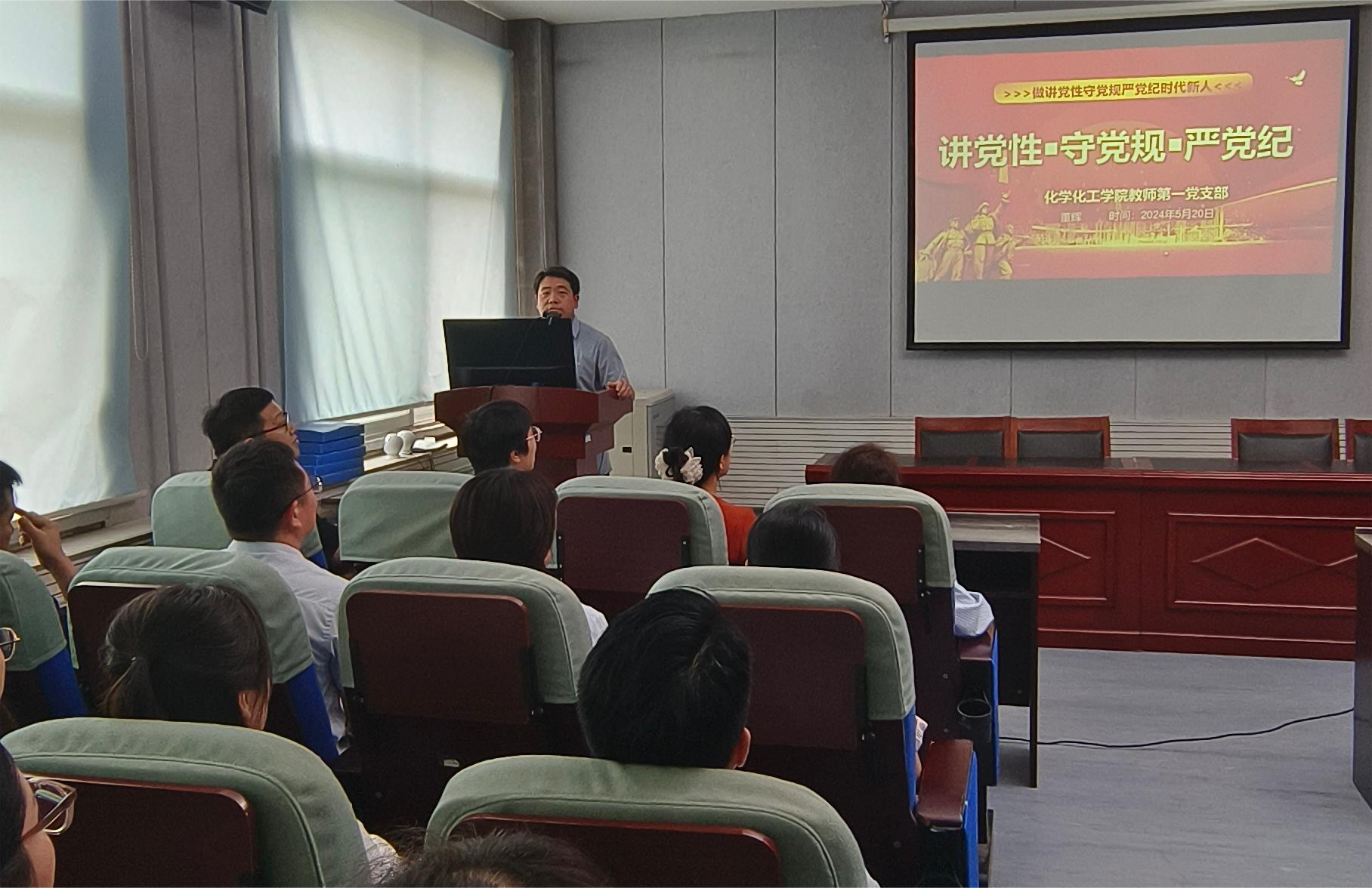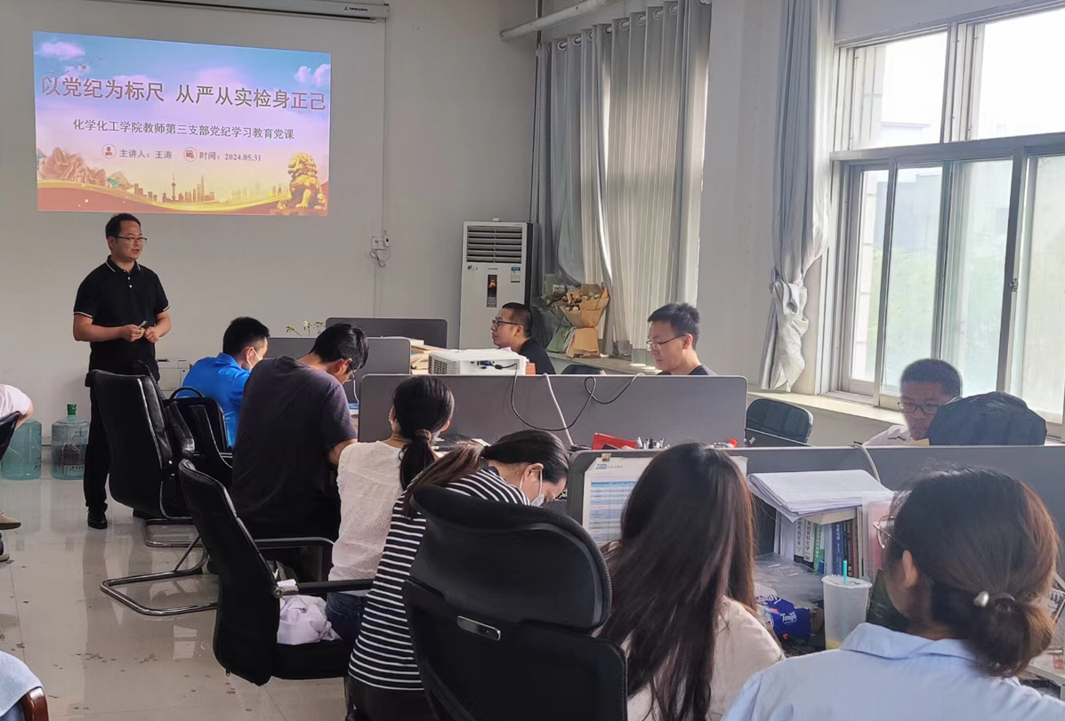5月20日,教师第一支部书记董辉以《讲党性,守党规,严党纪》为题,结合新修订的《中国共产党纪律处分条例》进行讲解。5月31日,教师第二支部书记胡新成进行党课教育,并带领支部成员对《中国共产党纪律处分条例》集中研讨学习,公司党委书记李海涛同志以普通党员身份参加支部学习研讨;教师第三支部联系领导王涛副经理深入支部进行《以党纪为标尺,从严从实检身正己》党课活动,并围绕《条例》进行“学纪律,强党性”知识竞赛主题党日活动;教师第四党支部进行“学《条例》,守党纪,强党性”主题党日活动,并进行集中研讨学习,公司党委副书记张颜梅参加并给与指导。