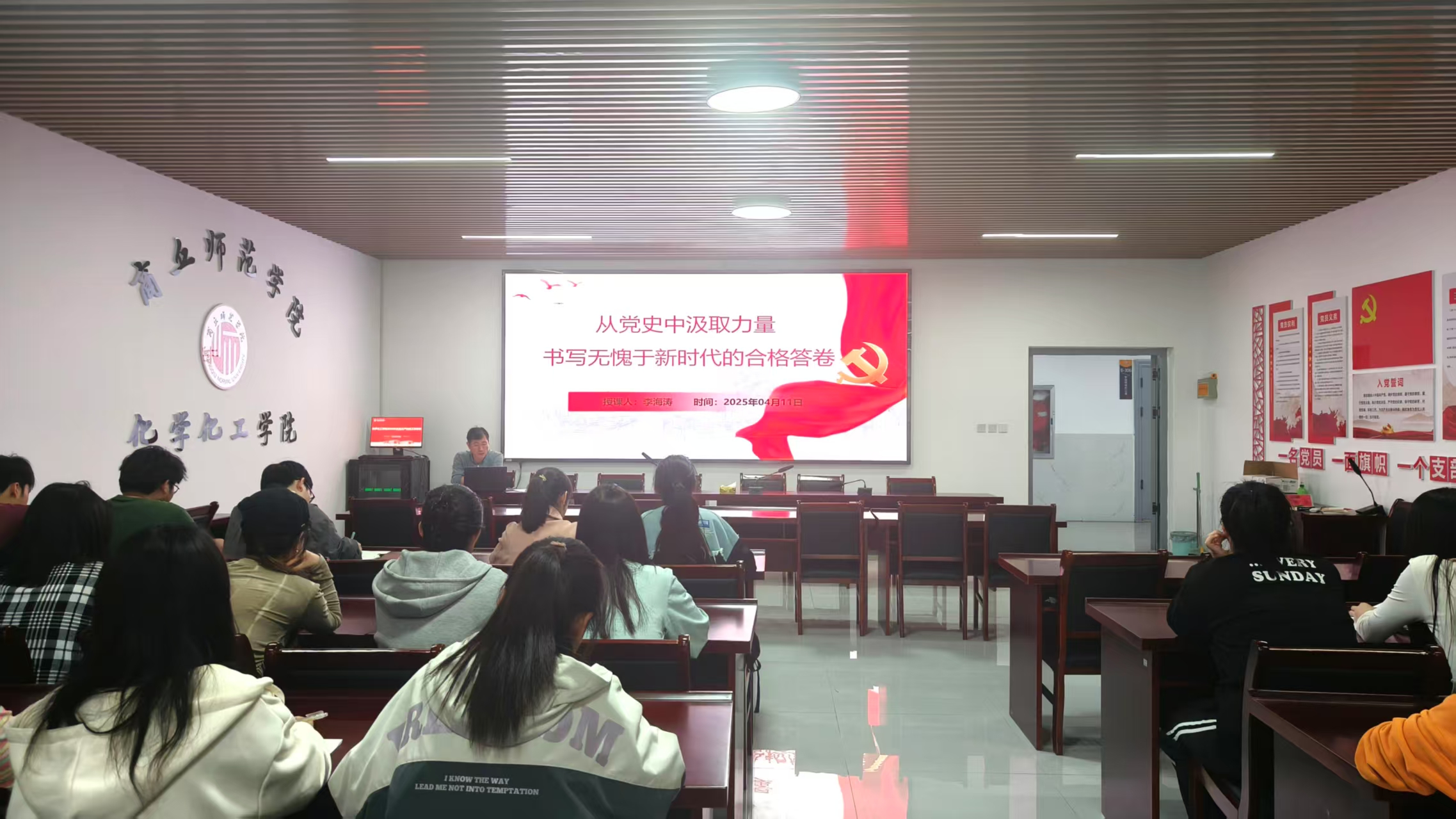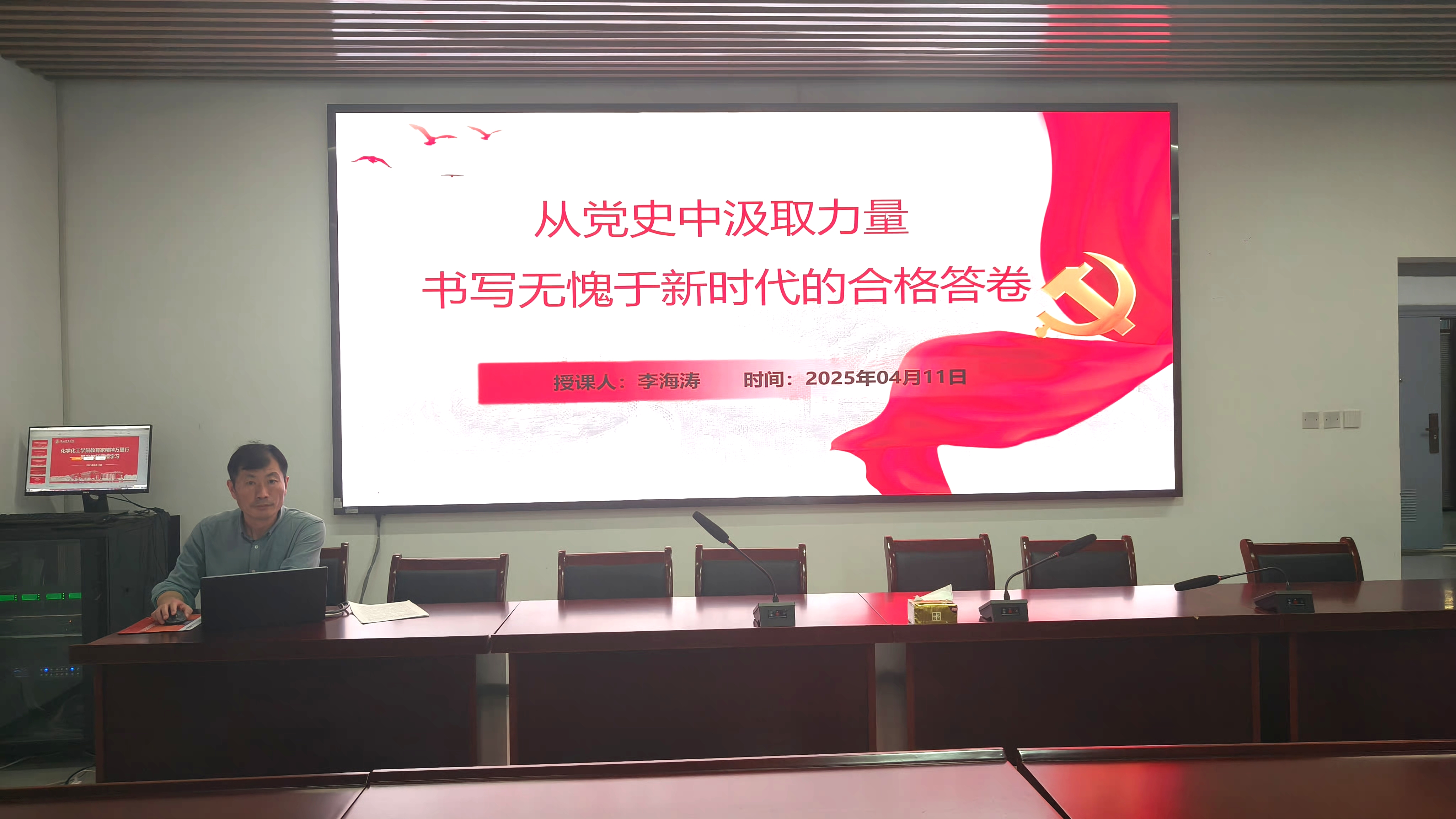 课上,李海涛以“从党史中汲取力量书写无愧于新时代的合格答卷”为题、以“知其所来,知其所为,知其所向”为主线,深入阐释党的历史精神内涵。在“知其所来,领悟‘三个不能忘记’中汲取初心的力量”部分,李海涛强调要不断滋养、锤炼初心,牢记党的百年奋斗历程,永葆对人民的赤子之心,牢固树立宗旨意识,站稳以人民为中心的根本立场,坚持全面从严治党,把人民群众放在心中最高位置,以实际行动取信于民。