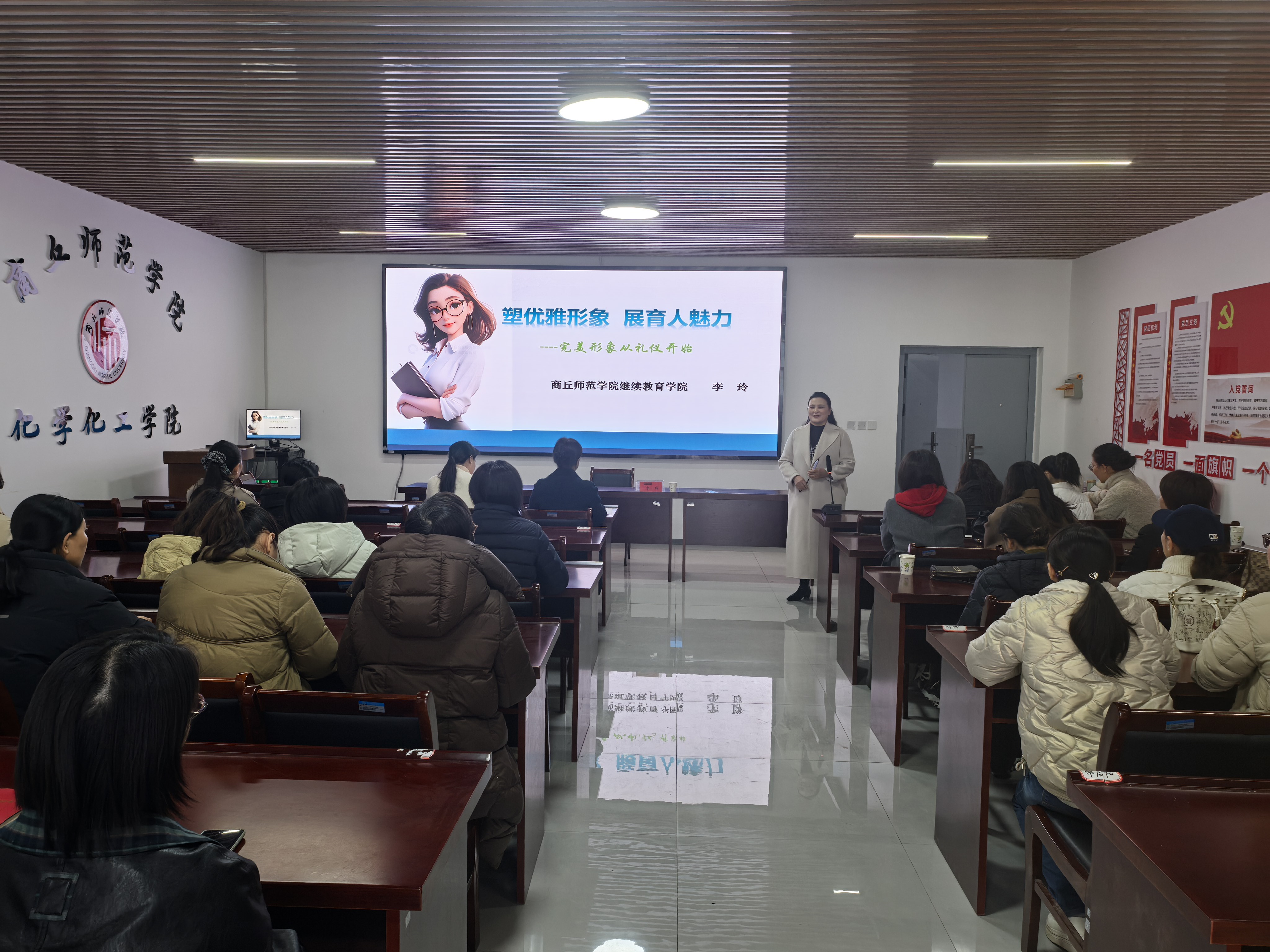 李玲教授作为河南省基础教育培训专家、国培专家库成员,深耕礼仪教学与培训领域,兼具深厚理论功底和丰富实践经验。讲座中,她以“形象即教育”为核心,从女教师形象管理、教师职业礼仪两大维度,结合高校教学工作实际,系统讲解仪容、着装、仪态的礼仪规范,以及见面、沟通等职场礼仪技巧。李玲教授引经据典、案例鲜活,既阐释了礼仪“尊重”的核心内涵,又针对女教师职业特点给出了具体建议,同时分享了与同事、员工的沟通方法,内容兼具专业性与实用性。