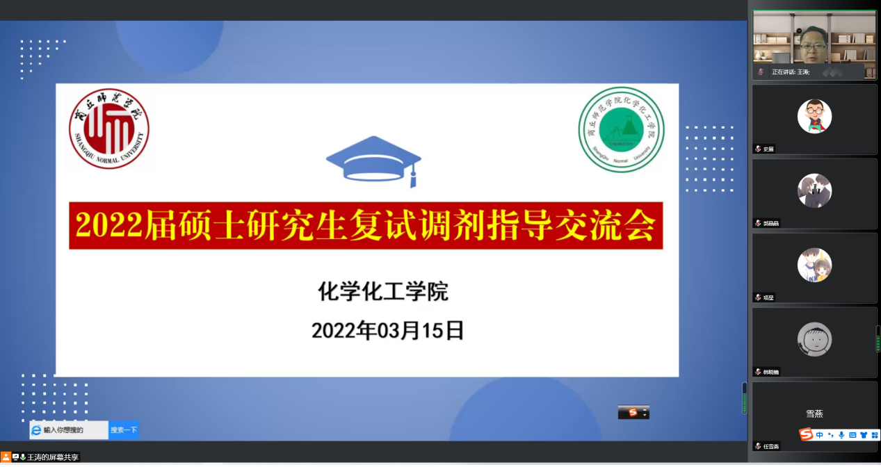 为进一步推进公司考研工作顺利进行,3月15日,beats365唯一官方网站采用腾讯会议举办了2022届硕士研究生复试调剂指导交流会。副经理王涛,2018级辅导员、班主任及部分考研员工参加了此次会议。