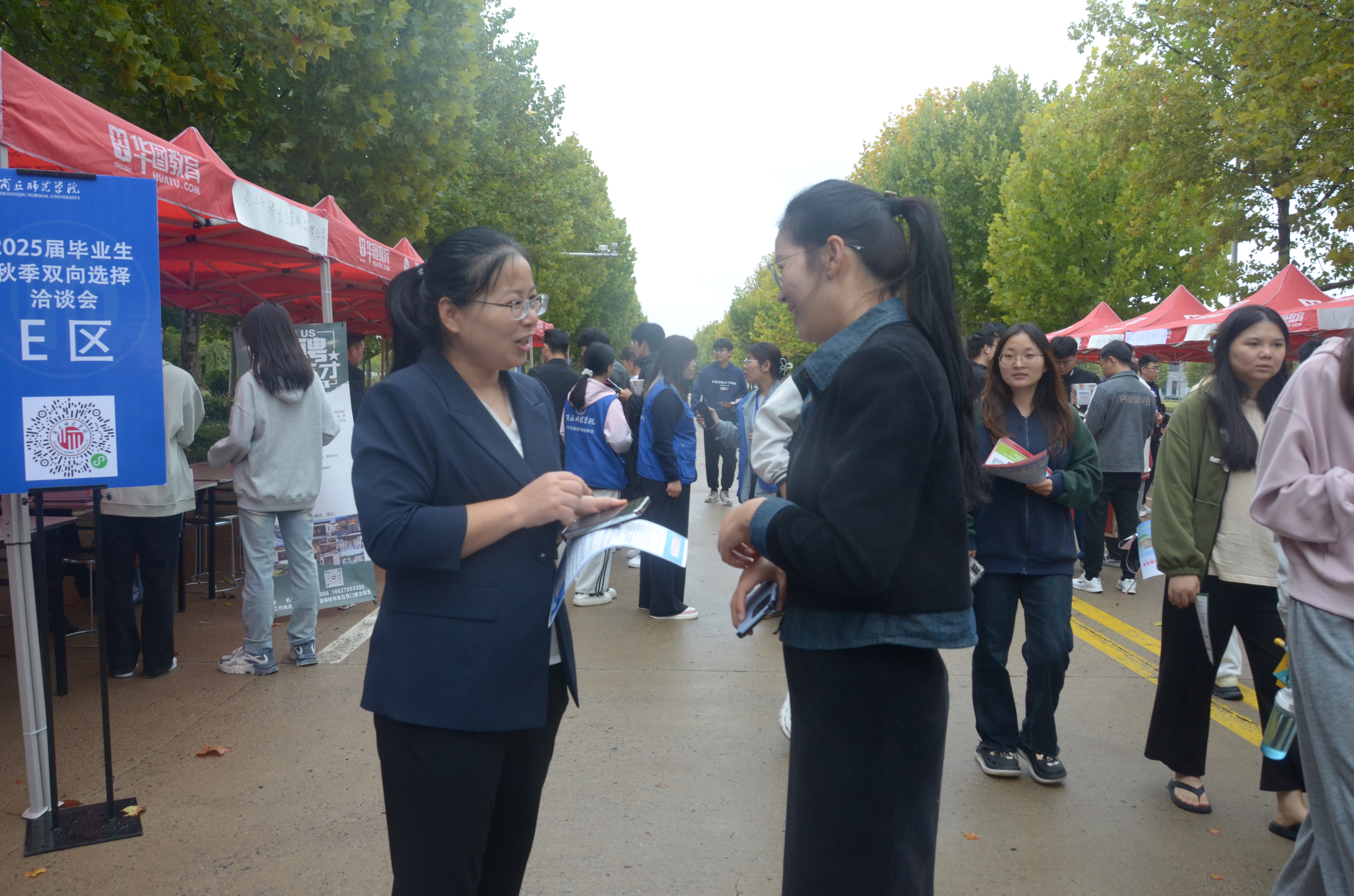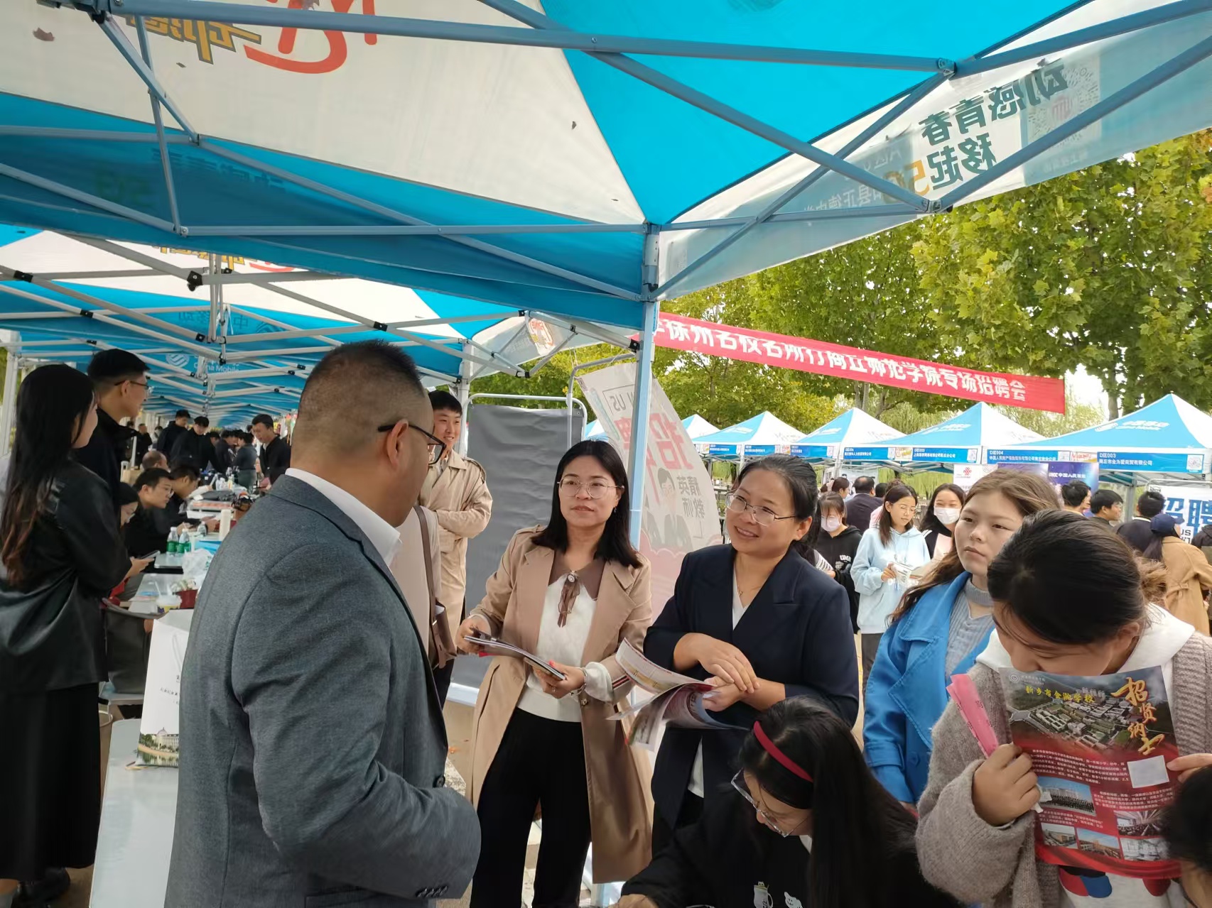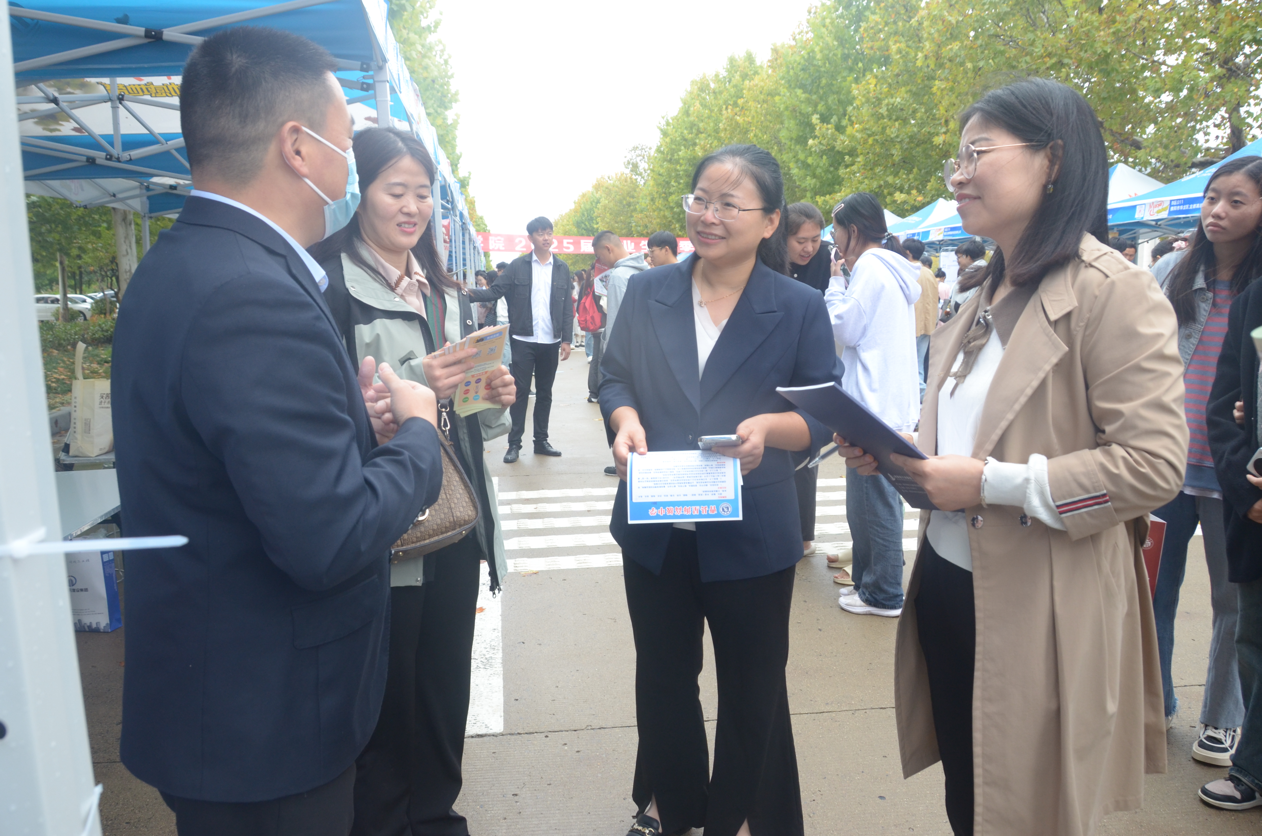 公司党委副书记张颜梅带领2025届毕业生辅导员郭家瑞来到洽谈会现场,深入了解了各用人单位的企业文化、岗位职责和职业要求,以便更好地为毕业生就业问题做出指导并为员工们解答求职过程中的各种问题。
