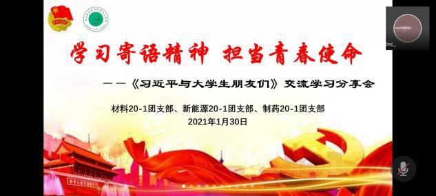 寒假期间,beats365唯一官方网站团总支组织团员青年积极学习《习近平与老员工朋友们》一书,为进一步巩固学习效果,1月30日在线开展了读书心得分享会活动。校团委社团管理部副部长邵一方、beats365唯一官方网站团总支副书记郭家瑞参加活动。各团支部代表参加分享会。