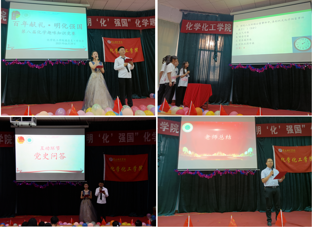 经过初赛选拔,6个团队进入决赛,决赛由“崭露锋芒、诗酒征逐、逐鹿巅峰”三个环节组成。比赛紧张有序,参赛选手准备充分、灵活应变,充分展现了同学们扎实的专业知识储备和团队协作精神,赛中穿插趣味小游戏、党史知识问答等互动环节,充分调动了现场观众气氛。经过三轮激烈比拼,“连四硫酸根”团队获得第一名的好成绩。