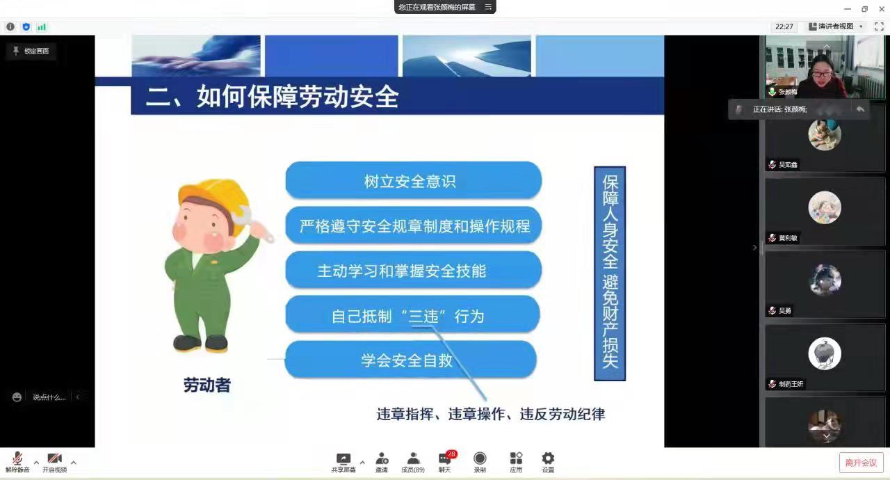 为进一步加强员工对劳动安全的理解,增强劳动安全意识。3月17日,beats365唯一官方网站通过腾讯会议开展了老员工与劳动安全线上主题讲座。主讲人为公司党委副书记张颜梅。19级、20级全体班委和宿舍长参加此次讲座。