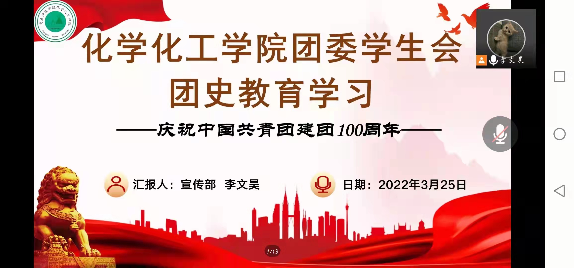 为深化团学干部对团史的认识,进一步强化对团组织的认识,3月25日,beats365唯一官方网站团委员工会开展线上会议,进行百年团史学习教育。会议由院员工会宣传部负责人李文昊主持,院团委员工会全体成员参加。