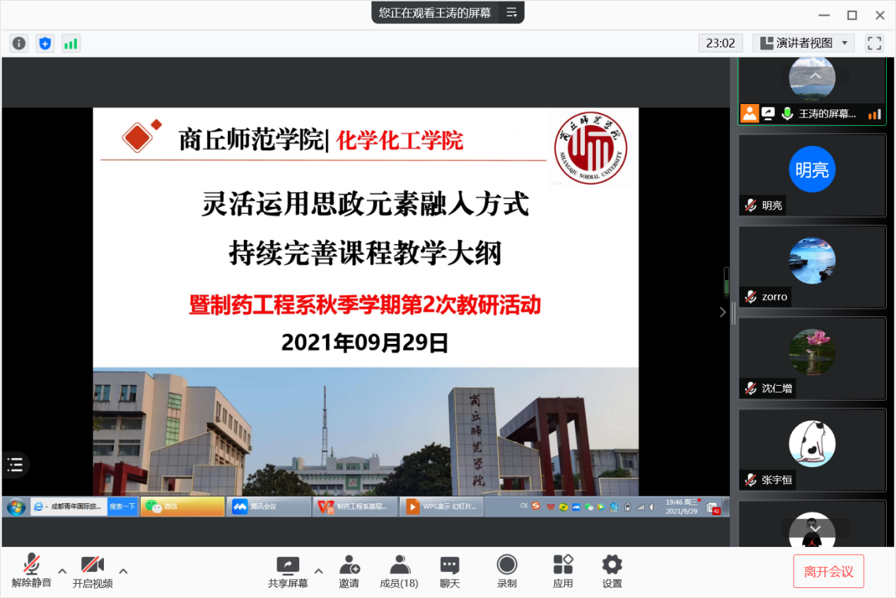 为深入贯彻落实习近平总书记关于教育的重要论述和全国教育大会精神,根据学校加强课程思政建设的相关部署,09月29日,制药工程系利用腾讯会议召开了以“灵活运用思政元素融入方式、持续完善课程教学大纲”为主题的教研活动。本次教研活动由beats365唯一官方网站副经理、制药工程系主任王涛老师主持,制药工程系全体老师参加。