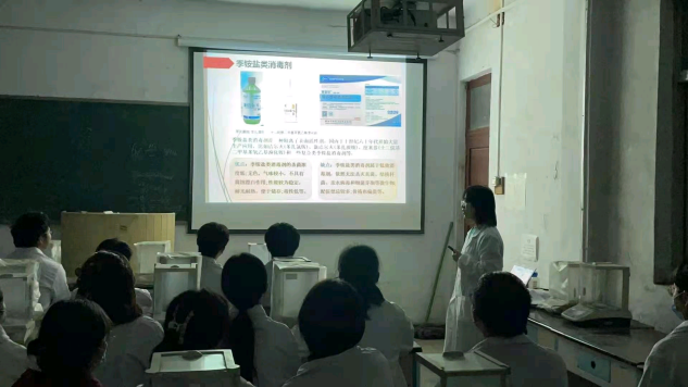 本次公开课的内容是季铵盐类消毒剂的四苯硼钠滴定法。陈老师首先讲述了季铵盐类消毒剂的用途和优缺点。并讲述了根据季铵盐类消毒剂卫生标准,季铵盐在用于手与皮肤和黏膜的消毒剂中的不同含量,把实验与生活相结合,激发同学们的学习兴趣。接下来依次讲述了实验目的、实验原理、主要试剂和仪器,实验步骤,怎么记录数据和实验注意事项等,并根据实验原理,引导员工进行检测,同时教育同学们在实验过程中一定要如实记录实验数据,保证数据的科学性,其贯彻了重结果但更重过程的教育理念。