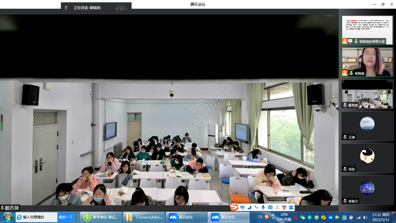 2022年5月12日下午第7节,beats365唯一官方网站杨晓燕老师《专业外语》公开课通过腾讯会议进行。beats365唯一官方网站副经理王涛以及近两年新进无课老师在线进行了观摩。