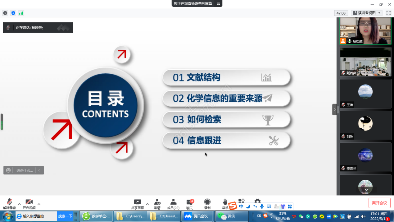 本次公开课前,员工通过学习通学习了《专业外语》相应的线上课程内容:化学文献的结构、重要来源、检索方法和信息跟进方法等内容。课中,杨老师在讲述一些抽象内容前,首先通过投票的方式考察员工的预习情况,接着讲述对应课程内容,加深理解。另外对于一些重要的知识点杨老师通过提问小组抢答加分的方式进行,充分调动员工参与课堂讨论的积极性。为使员工更好地理解和把握化学文献的相关知识,杨老师补充了文献管理软件的使用,并进行课堂演示。最后,巩固练习环节,杨老师以化学文献在正文中的引用实例,检测员工应用理论知识解决实际问题的能力。整个课堂气氛非常活跃,员工参与度较高。