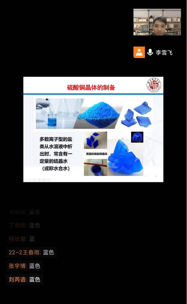 本次公开课的内容是硫酸铜晶体的制备。李老师首先带领同学们回顾了称量操作实验课上所用到的试剂,并由此引出了本次课程所要制备的对象。随后就硫酸铜晶体制备过程中的实验原理、所使用的实验仪器、药品以及实验步骤等几方面展开了详细的讲解。通过视频的方式向同学们展示了减压过滤的操作,从而进一步加深同学们对实验过程的把控和相关知识点的理解,提高了学习效率。整个教学过程由浅入深,循序渐进,课堂气氛轻松愉快,易于员工学习。