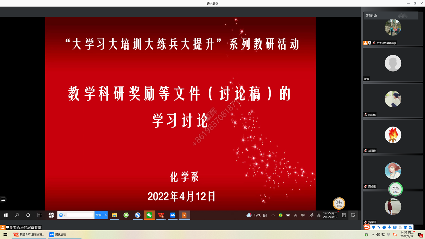 4月12日,化学系组织全体教师通过腾讯会议开展了能力作风建设集体大讨论活动,本次活动由系主任韦秀华主持。
