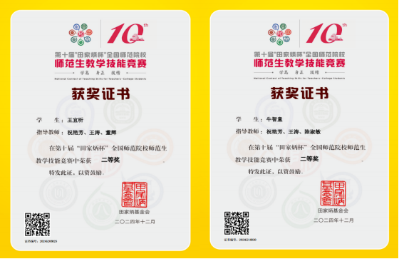 2024年11月29日至12月1日,第十届“田家炳杯”全国师范院校师范生教学技能竞赛决赛在浙江师范大学落下帷幕。公司2021级王宜昕、2022级牛智童在众多来自全国各地的优秀选手中表现出色,分别荣获高中化学组、初中科学组全国二等奖。