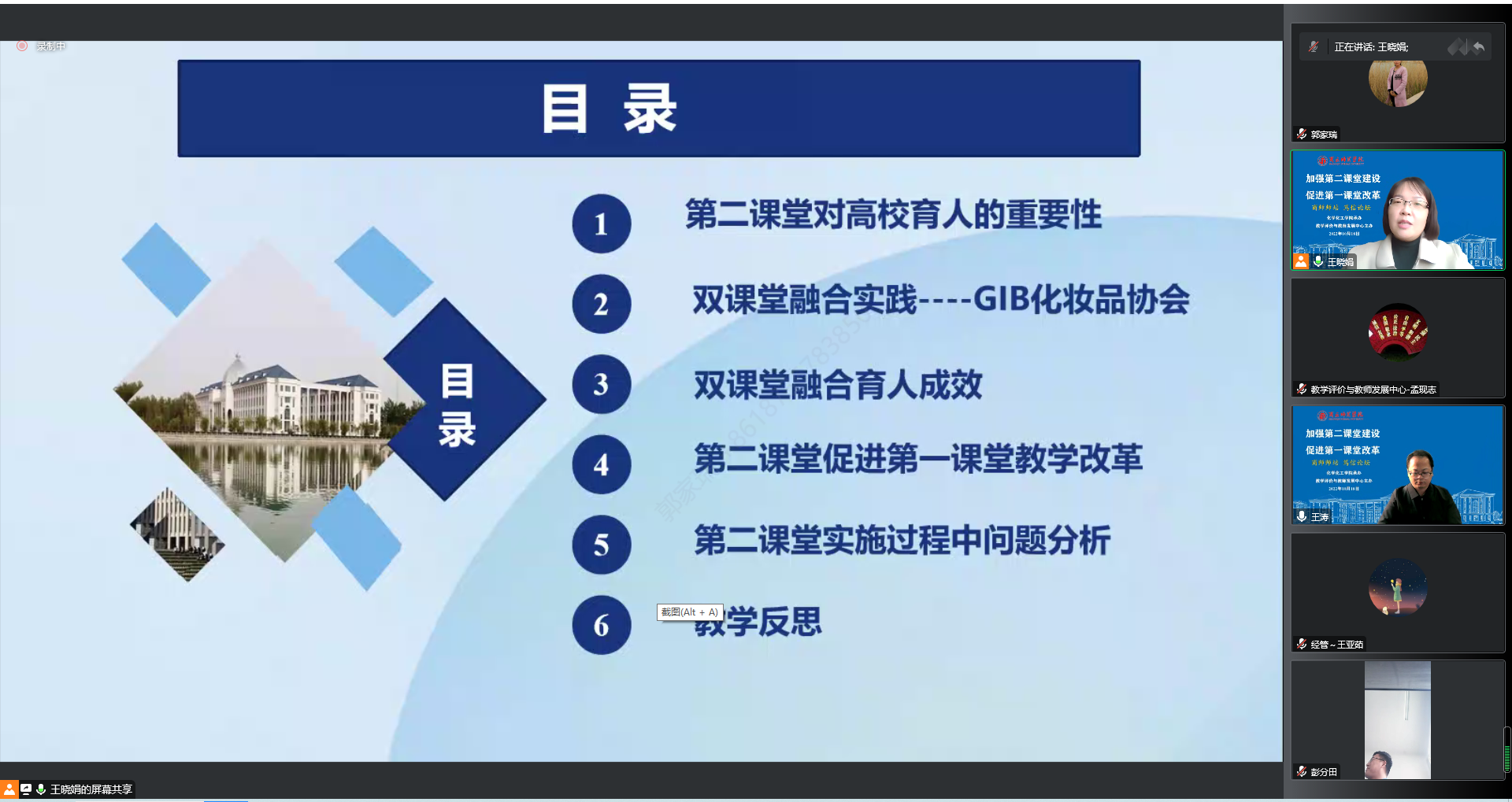 接下来,王涛向大家介绍了主讲人王晓娟老师的基本情况,王晓娟从教10年,在重视第一课堂教学的同时,持续指导员工围绕专业培养目标,开展第二课堂实践活动,通过第一课堂、第二课堂的相互融合促进,教学成果突出,育人成效显著。王晓娟根据自己指导的GIB化妆品协会的发展为轴,介绍了第一课堂理论教学如何指导第二课堂实践活动,第二课堂又是如何促进第一课堂教学改革。最后通过第二课堂实施过程中的问题分析和教学反思,倡导一线专业课老师在站稳第一课堂的同时,要尽量为员工搭建“以知识为牵引,兴趣为导向”的第二课堂,提高两个课堂协同育人能力。